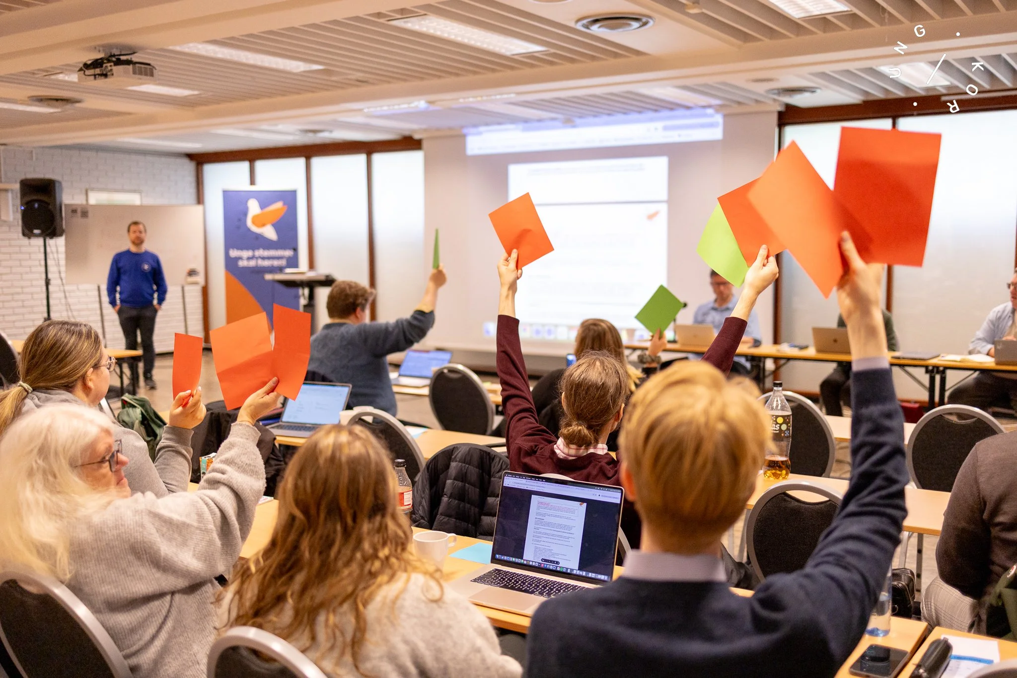 Landsmøtet til Ung i Kor med alle deltakere tilstede: styremedlemmer, styreledere, unge ledere, representanter og ansatte i organisasjonen.