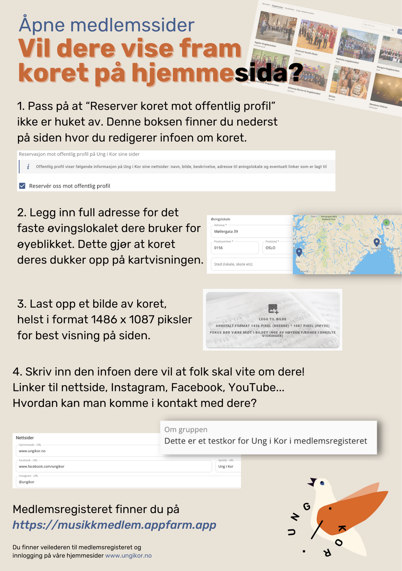 Gjennom medlemsregisteret kan koret legge inn informasjon så de vises på våre åpne medlemssider her på hjemmesida vår.